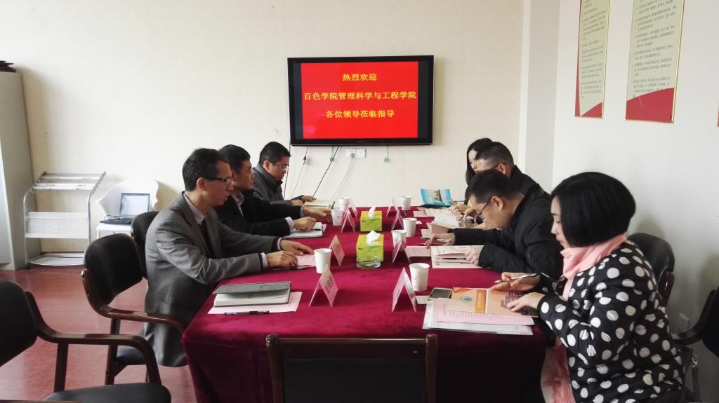 11月30日上午,百色学院管理科学与工程学院院长周叮波一行4人来工口漫画 调研。学院院长郑荣跃、副院长柳俊哲、刘干斌等接待了来访客人。