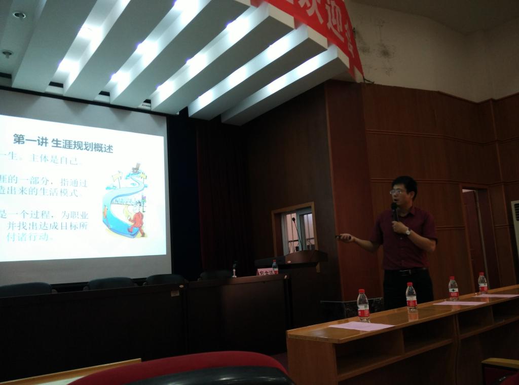 2015年9月11日,学院2015级新生在学院报告厅迎来了大学“第一课”: 大学从职业生涯规划开启。本次主题讲座由院党委副书记俞金波老师主讲,为学院2015级89名新生带来一堂别出心裁,精心打造的入学第一课。讲座内容涵盖了生涯规划概述、探索自我、探索工作世界等三个方面,为2015级新生的大学生活、学习指路引航。
