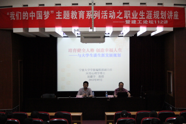 5月23日晚6点,“我们的中国梦”主题教育系列活动之职业生涯规划讲座在建工学院报告厅举行,讲座由建工学院党委副书记袁红辉老师主持,主讲人是原献学教授。原教授是我校学报编辑部常务副主编、应用心理学博士,他给我们带来了一场别开生面的“培育健全人格,创造幸福人生——与大学生谈生涯发展规划”的讲座。