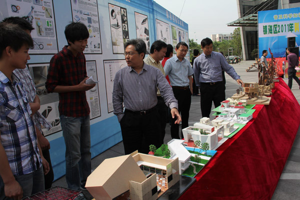 学生展示了具有建工特色的科技创意作品,吸引了许多市民驻足观看,区委副书记、区长陈召华还就工口漫画