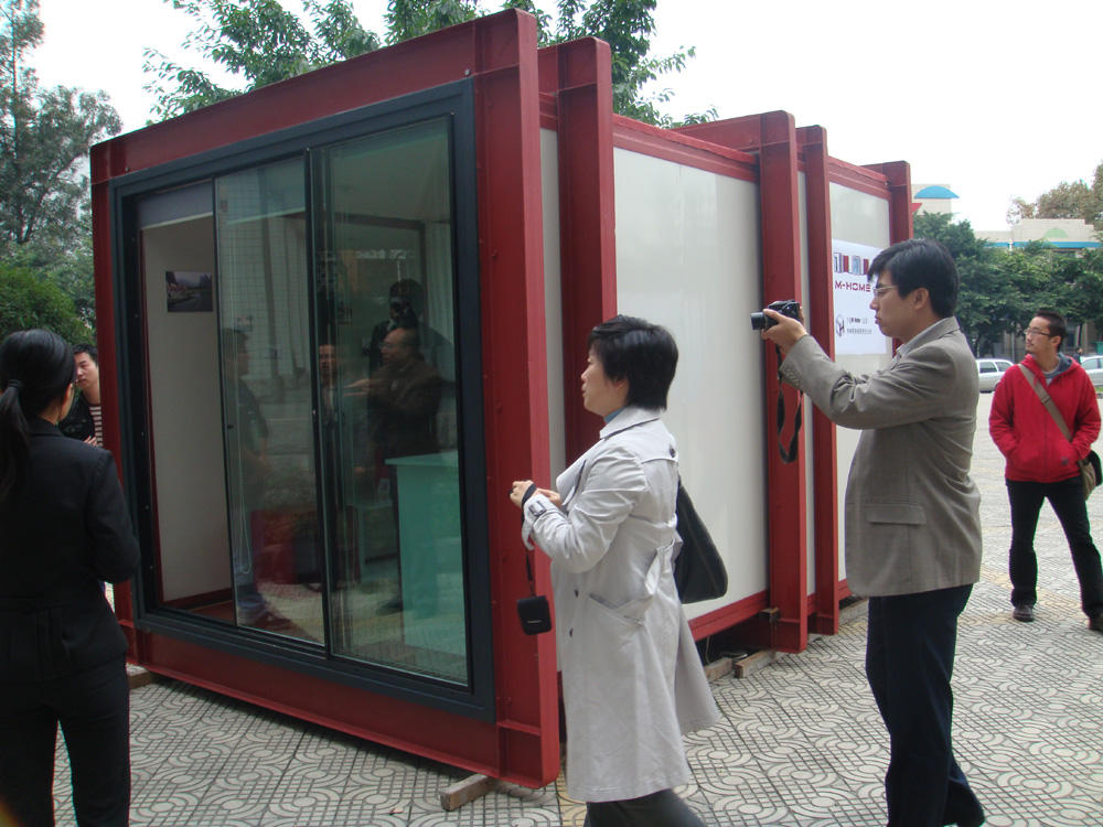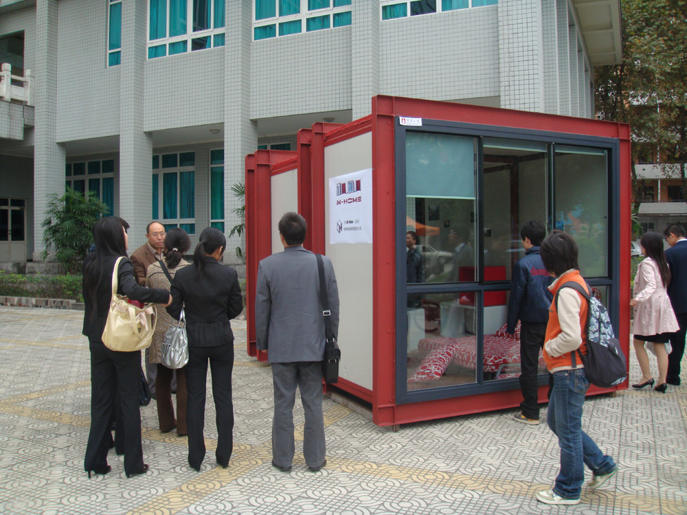 “M-home特种用房有限责任公司”创业团队的设计作品为新型简易环保住房,主要针对建筑工地、旅游区、灾区等所需的临时建筑要求进行设计的。M-house,意为“我的家”,红色屋顶,白色墙壁,看起来非常美观。采用钢架折叠结构,折叠后占用空间较小,运输便捷,安装方便。它可以三个叠加在一起,占用土地的面积更小。在房间内,还有一套可折叠式的简易家具,生活的舒适度会更高。其墙体采用隔温、防雨的高科技材料制成,可以避免日光烘烤带来的闷热问题。用四个“小腿”来固定地面,经模拟测试可以抵御10级以下的大风。比起活动板房来,它少了用水泥固定地面的繁琐,避免了水泥对土地的破坏,因此更加环保。另外,M-house一个独特的优势就是重复利用率接近100%。设计者蔡小斌说,普通的活动板房在拆除后,其材料二次利用度仅为45%到60%,而拆除后,除个别零件需要必要的修复外,几乎无需添加任何材料就能再次使用。