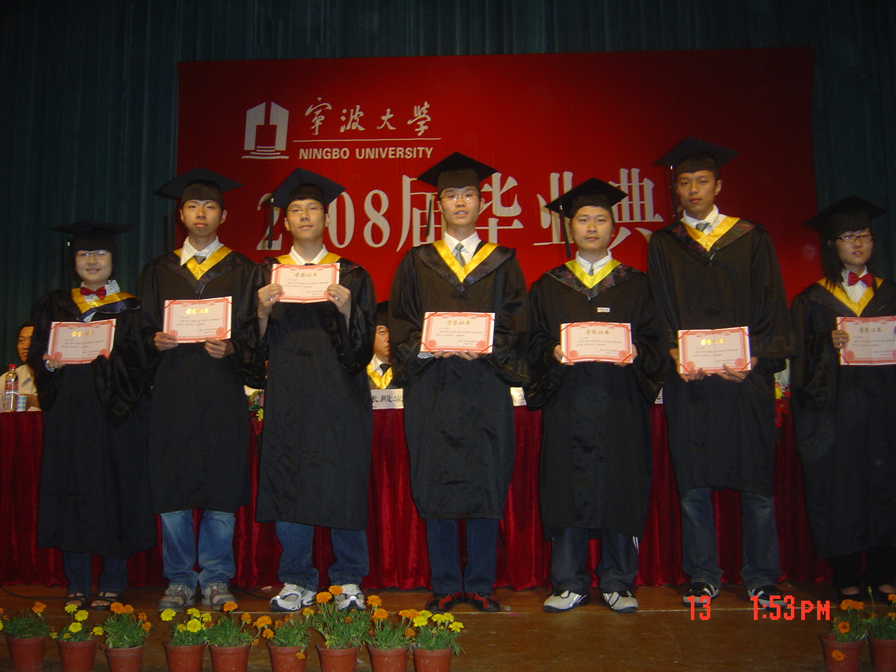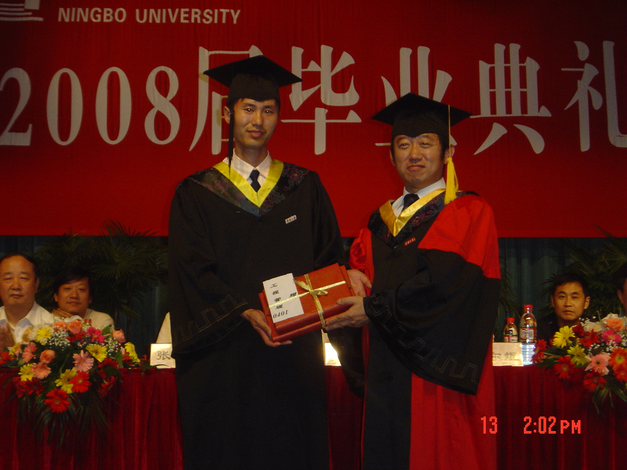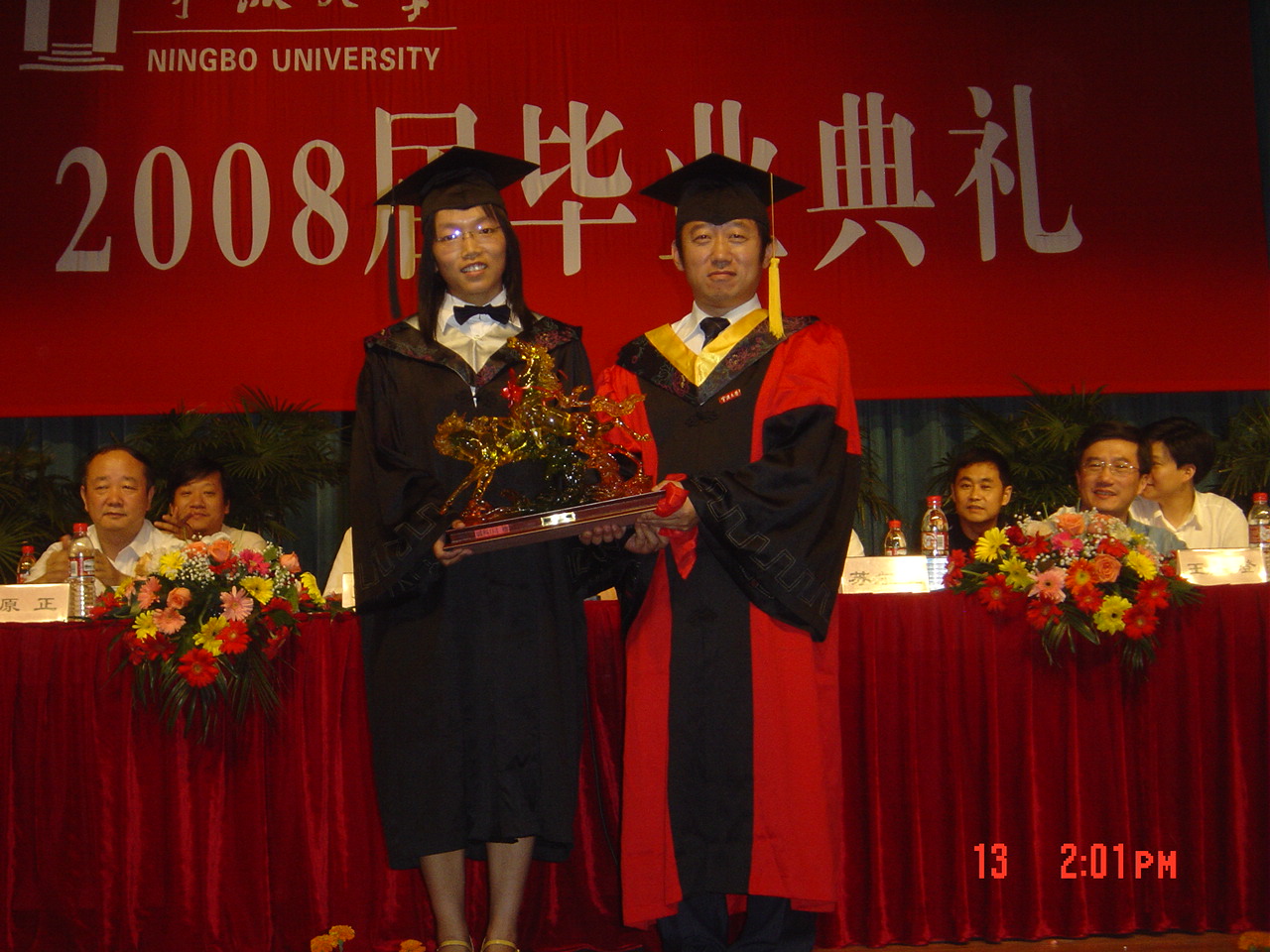 典礼仪式上还公布了获得2008届省级、校级优秀毕业生名单、学院考研金牌班级名单及考研优秀奖学金获得者名单。主席台就座领导为相关获奖集体和个人颁奖。毕业生代表孔铭钟同学代表全体毕业生在典礼上作了发言,毕业班代表向学院赠送了纪念品,祝愿母校办学事业蒸蒸日上。最后,学院主持工作副院长张殿发为全体毕业生授予学位、颁发毕业证书并与毕业生们一一合影留念。