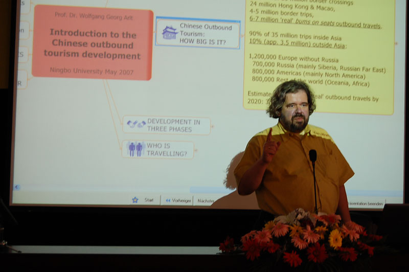 阿尔特教授凭借其在国际旅游实践和研究方面丰富的理论和实践经验,给我校师生们进行了一场生动有趣、别开生面的报告。在报告中,他首先从国际视野出发,以最新旅游统计数据和抽样调查为基础,描述了中国出境旅游的地域和阶段特征。深层次分析了中国游客在不同文化情境下的旅游行为、中国游客赴欧旅游的动机和不同游客群体、中国和欧洲游客之间的知识鸿沟以及跨文化差异等。最后,阿尔特教授从国际旅游发展的态势以及针对目前中国出境旅游中存在的问题,提出中国出境旅游组织面临的挑战、任务以及旅游产品的营销战略。报告结束后,师生们积极踊跃地用英语提出各种专业性问题,阿尔特教授通过具体的案例给予了解答。