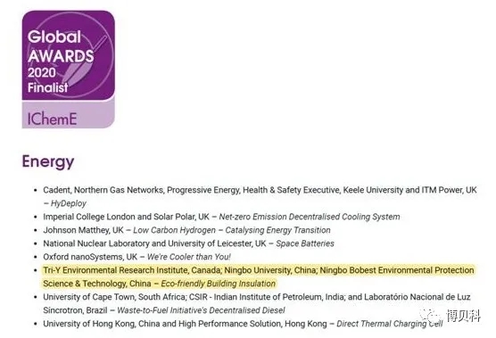 2020年9月14日,英国化学工程师协会 (The Institution of Chemical Engineers, IChemE) 公布了2020年度全球奖入围优胜获奖名单 (IChemE Global Awards 2020 Finalists),绿色建筑保温材料 (Eco-friendly Building Insulation) 获得能源奖项 (Energy Award), 奖项合作单位为:加拿大查韦环境研究院;工口漫画 ;宁波博贝科环保科技有限公司