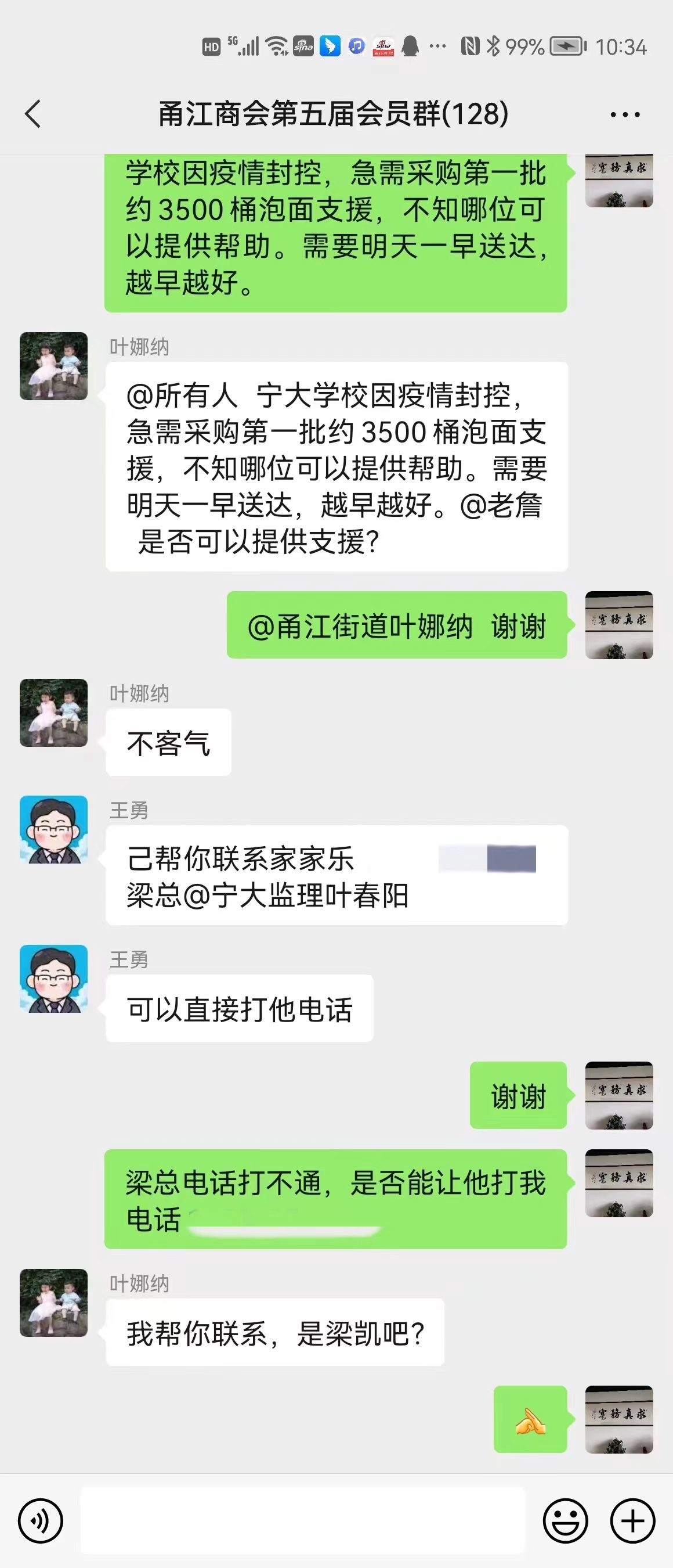 叶春阳先生一直关注着学校疫情防控工作,疫情发生第一时间主动联系学院:“学院有什么需求,我们可以做的尽管提,我们在外面想办法。”了解到学校2万多学生就餐,封控第一天后勤人力物力吃紧,叶春阳先生积极联系社会力量,12日晚在“甬江商会第五届会员群”中发布物资需求信息,甬江商会第五届会员们积极响应,两分钟后会员王勇先生就帮忙联系到了物资,叶春阳马上代表公司采购了3500桶方便面送达学院,为学校疫情防控工作提供了有力的物资支持。其后,还有许多甬江商会第五届的会员们不断发来消息:“还需要物资吗,我们可以提供!”“这是我的手机号,有需要直接打我电话。”“面对疫情,同舟共济!”……这些热诚的关怀和帮助让学院师生备受感动。