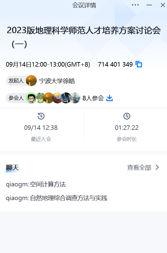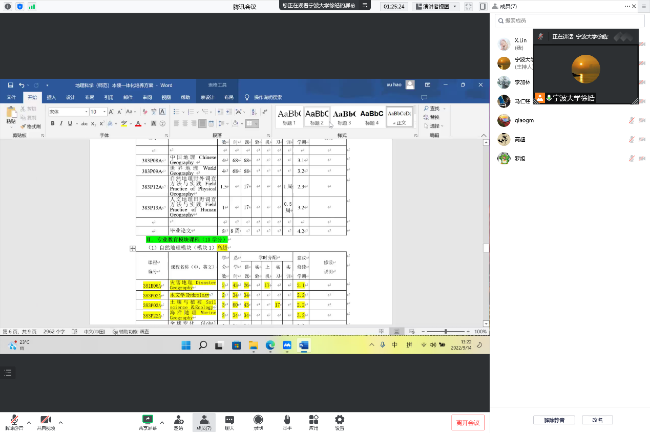 2022年9月14日,受台风影响,原定于线下进行的人才培养方案讨论会改为线上进行。为了适应基础教育对高水平师资的需求,地理科学(师范)专业先后与教务处、研究生院探讨了本研一体化模块的设计、选课与学分互认等事宜,初步确定了在2023版本专业人才培养方案中加入本研一体化设计的思路。同时,为响应教育部强化基础课程、夯实学生数理基础的号召,本专业与材化、环境等专业共同商定了涵盖高等数学、大学物理的学科基础课程平台课程。