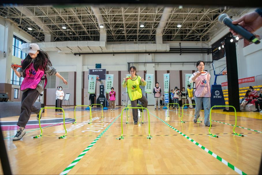 上午10点整,在8支参赛队伍整齐响亮的口号声过后,挑战赛正式开始。第一个环节是“青出于蓝”抢位赛,参赛队员必须在限定赛道上运输小球,并在将小球运到终点的同时,回答垃圾分类问题,用时越短排名越高。紧接着第二个环节开始的是“谁与争锋”争夺赛与“舍我其谁”巅峰赛,场上气氛激烈,8支队伍都拼尽全力。