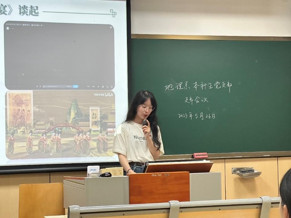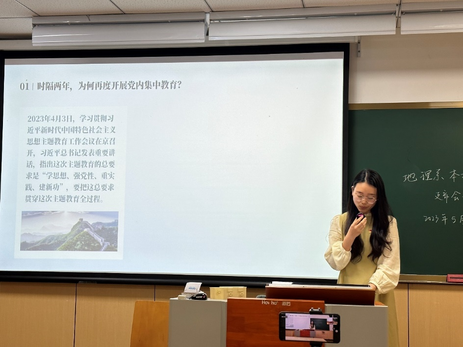 为深入开展习近平新时代中国特色社会主义思想主题教育,5月26日,工口漫画 地理系本科生党支部以线上线下相结合的方式,在东校区教学楼6-110开展主题教育党日活动,会议由支部书记王彩依主持,支部指导老师朱剑琼列席。