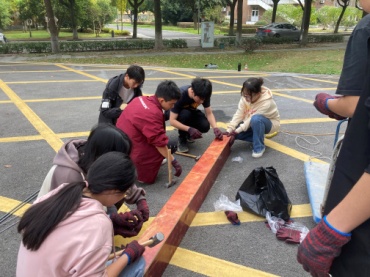 虽然钢筋混凝土梁是土木工程专业中最基本和最常用的构件,对于学生而言并不陌生,但制作钢筋混凝土梁的工序较多且很多操作是课堂上无法传授的。首先,学生们观看指导老师和工匠们的示范教学,然后学生们戴着手套,拿着榔头敲钉子组装木模;在操作台上折弯钢筋,用扎丝绑扎钢筋骨架,固定保护层垫块,最后小组成员们一起齐心协力将钢筋骨架抬入木模,上午各组顺利完成了钢筋骨架模型的制作。下午,学生们在指导团队的带领下,分工合作,进行了场地准备、原材料称取、混凝土配制、浇筑、振捣密实和覆盖薄膜养生等工作,各组圆满完成钢筋混凝土梁的制作。