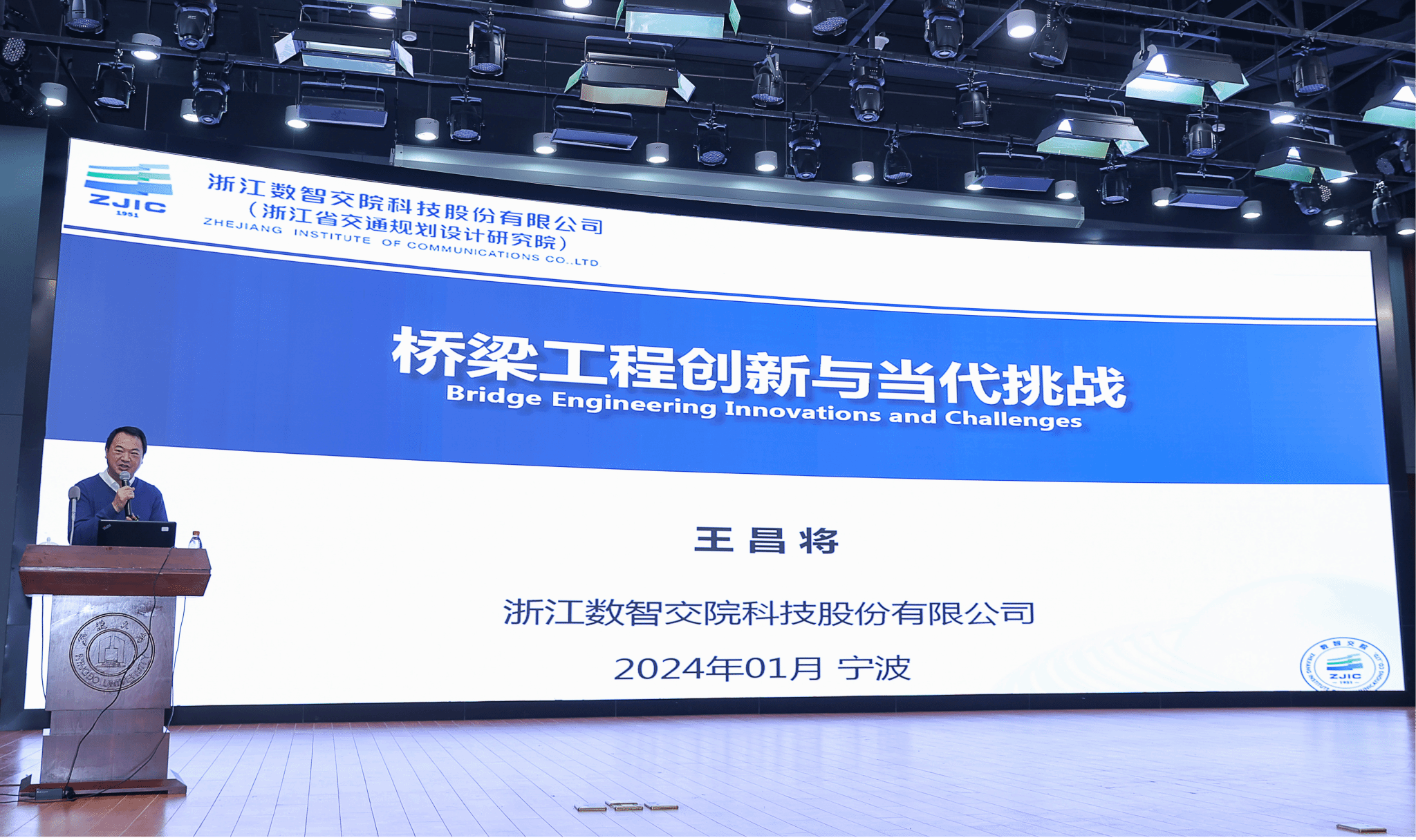 浙江省交通规划设计研究院副院长、浙江省勘察设计大师、正高级工程师王昌将,以《桥梁工程创新与当代挑战》为主题作报告,围绕桥梁工程设计哲学、创新动机和当代桥梁工程需要面临的挑战这三个方面展开讨论。王大师阐述了“四因”设计哲学对于大桥创新设计工作的指导作用,从国家发展战略的角度出发,探索了当代桥梁工程面临的双碳目标所带来的设计、施工和运营上的挑战,并分享了突破难题的诸多创新思路。
