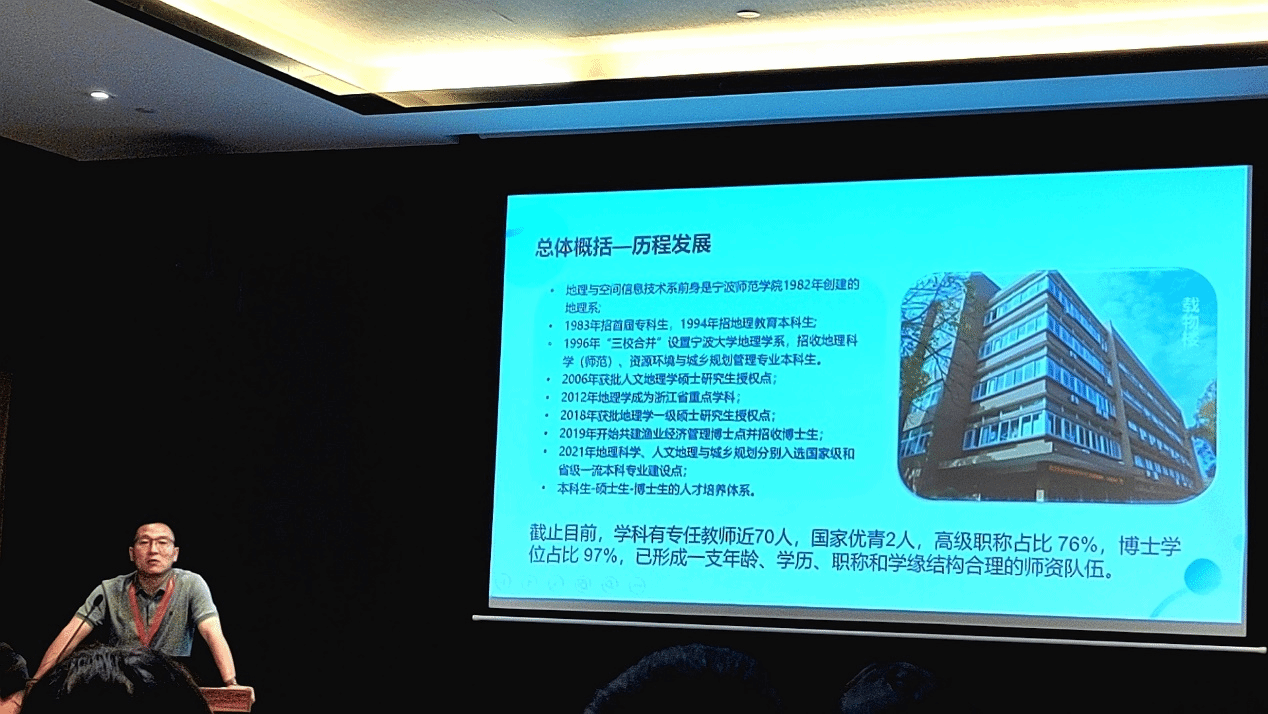 我校教育部高等学校地理科学类专业教学指导委员会委员王楠教授、地理与空间信息技术系副主任杨晓东教授参加了会议,杨晓东教授在分论坛二“地理学教材与课程建设”中做了“生物地理学在滨海地区建设实践”的报告。该报告回顾了地理系的发展脉络,介绍了当前的现状。同时,着重强调生物地理学在滨海地区的课程建设,应该在传统知识基础加上岛屿生物地理学、低山丘陵垂直地带性、海陆水平地带性的内容;同时要注意知识更新,加入人类活动和气候变化对生物地理过程的影响。课程思政设计应该润物无声,在生物地理格局中,利用本地“四明山横坎头和章水镇的红色资源,定海的鸦片战争古炮台遗迹”,在实习实践同时,开展思政教育。