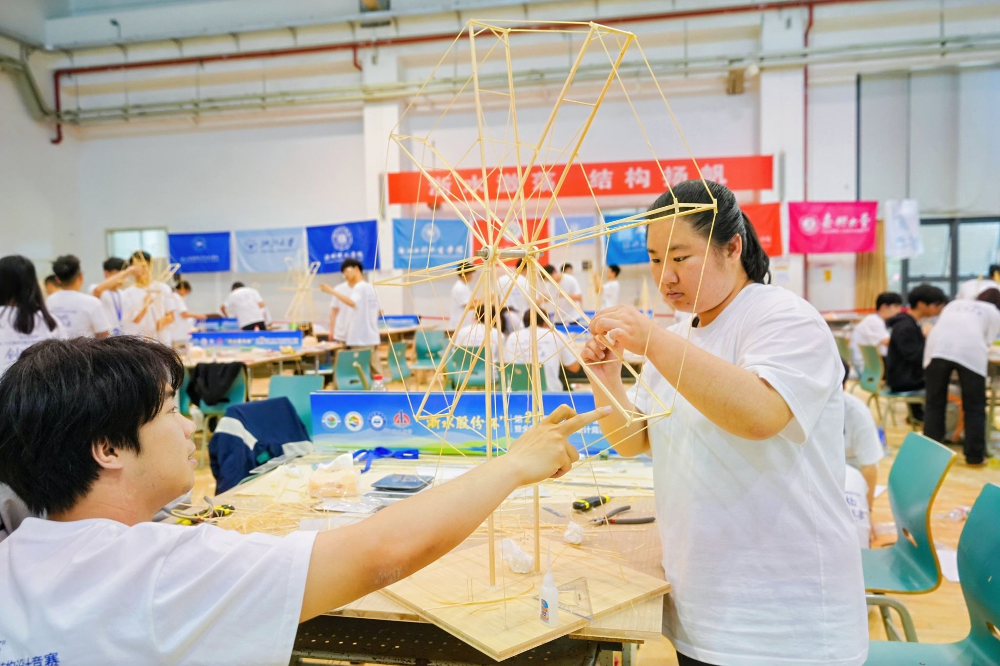 本次竞赛于5月9日至11日在浙江海洋大学举行,吸引了来自全省49所高校的102支队伍同台竞技。被誉为"土木皇冠上最璀璨明珠"的该项赛事,今年以"摩天轮结构设计与模型制作"为题,对参赛选手的创新设计能力和工程实践水平提出了极高要求。
