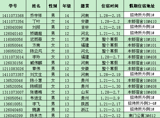 一、申请留宿学生统一集中住宿,女生安排在本部宿舍10#楼、男生安排在本部宿舍14#楼以及本部学生公寓招待所(本部公寓四期楼下),个别学生安排在寒假开楼宿舍,住宿名单分别张贴在集中住宿楼内,同时在学生社区网上也进行公布。