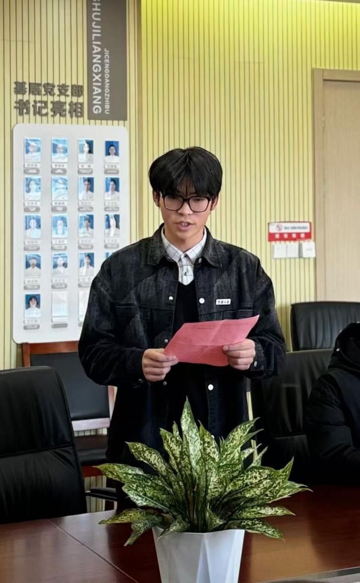 2023 级茅以升班班长王远荣作为学生代表发言。他感谢了姜亮董事长、郑嫦月女士,以及北京茅以升科技教育基金会和土环学院领导、老师们。他表示:此次奖学金设立不仅是物质支持更是精神激励,作为首届茅以升班班长,他将带领同学们传承茅以升精神,努力钻研学业,以实际行动回馈各界关爱。