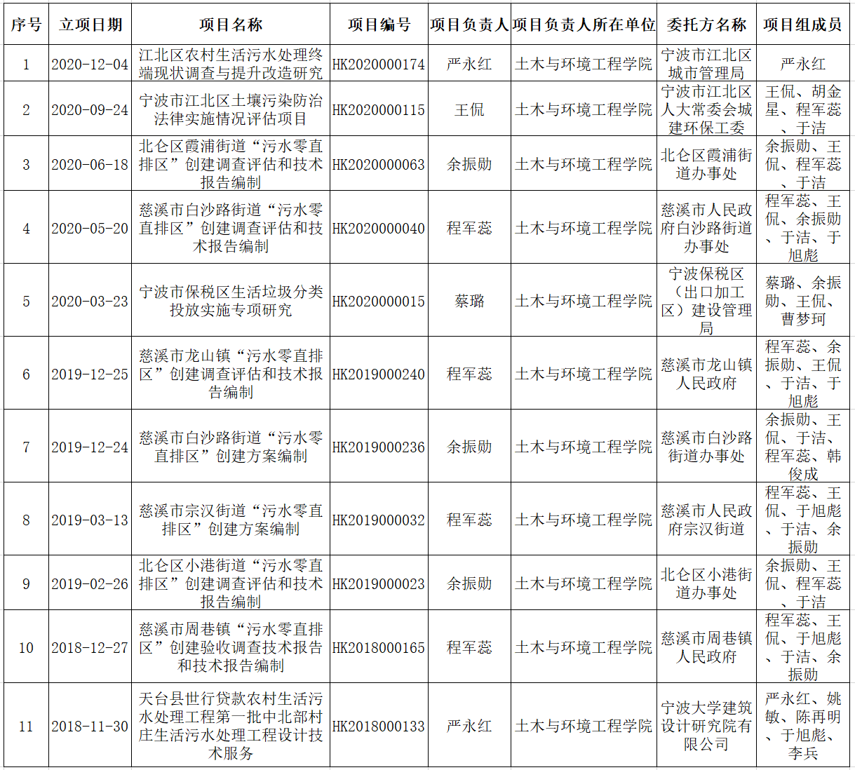 成员:王侃、余振勋、蔡璐、姚敏、程军蕊等积极参与江北区、慈溪市、北仑区、天台县等地的污水零直排、农村生活污水治理及生活垃圾分类等项目。