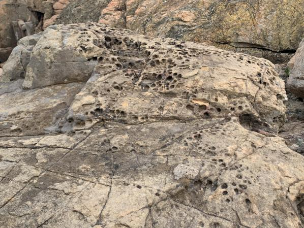 第三天一早,前往白山景区。受花岗岩的球状风化与卸荷作用形成的垂直或水平裂隙影响,白山奇岩怪石、奇洞异缝遍布。此外,同学们在山上多处观测到了海蚀凹槽等古海蚀地貌,在山脚,海蚀阶地更是一览无余。