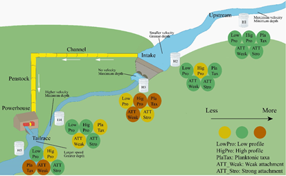 目前世界范围内一半以上河流受到筑坝影响,且小水电数量已达到82891座(中国约占51%)。尽管小水电在河流生态系统服务(如发电、灌溉)中具有重要作用,但也是影响河流生态系统的一个重要因素。通过研究筑坝对河流生态系统的影响可以很大程度了解人类活动对水生态环境的干扰及强度,为绿色小水电开发提供科学依据。本文以底栖硅藻为研究对象,分析了23个小水电对硅藻功能性状、物种及功能多样性的影响,发现这些指数在取水口上下游以及出水口上下游河段具有明显差异,其中功能丰富度、冗余度和均匀度差异尤其显著。此外,硅藻功能性状因受到小水电的影响呈现功能性适应(由适应激流生境的物种性状向适应缓流生境的物种性状转变,图1)。物种和功能多样性指数受水文、理化因素(特别是流速和水深)的共同影响。因此,未来研究应基于小水电的长期监测,研究其对水生态系统的潜在影响,确定生态流量、提高河流连通度,从而协调生态保护与水电开发。该研究对我国山区小水电的合理开发和管理具有重要借鉴意义。