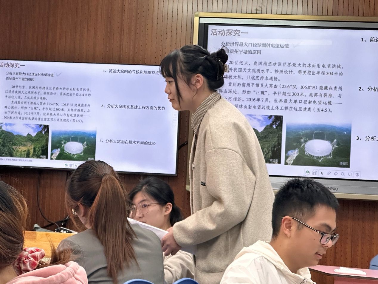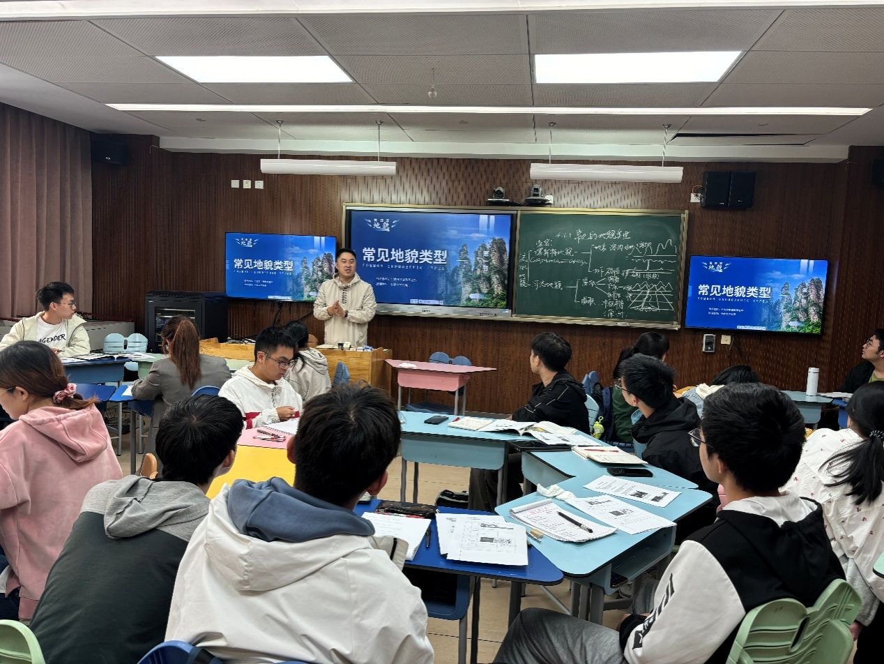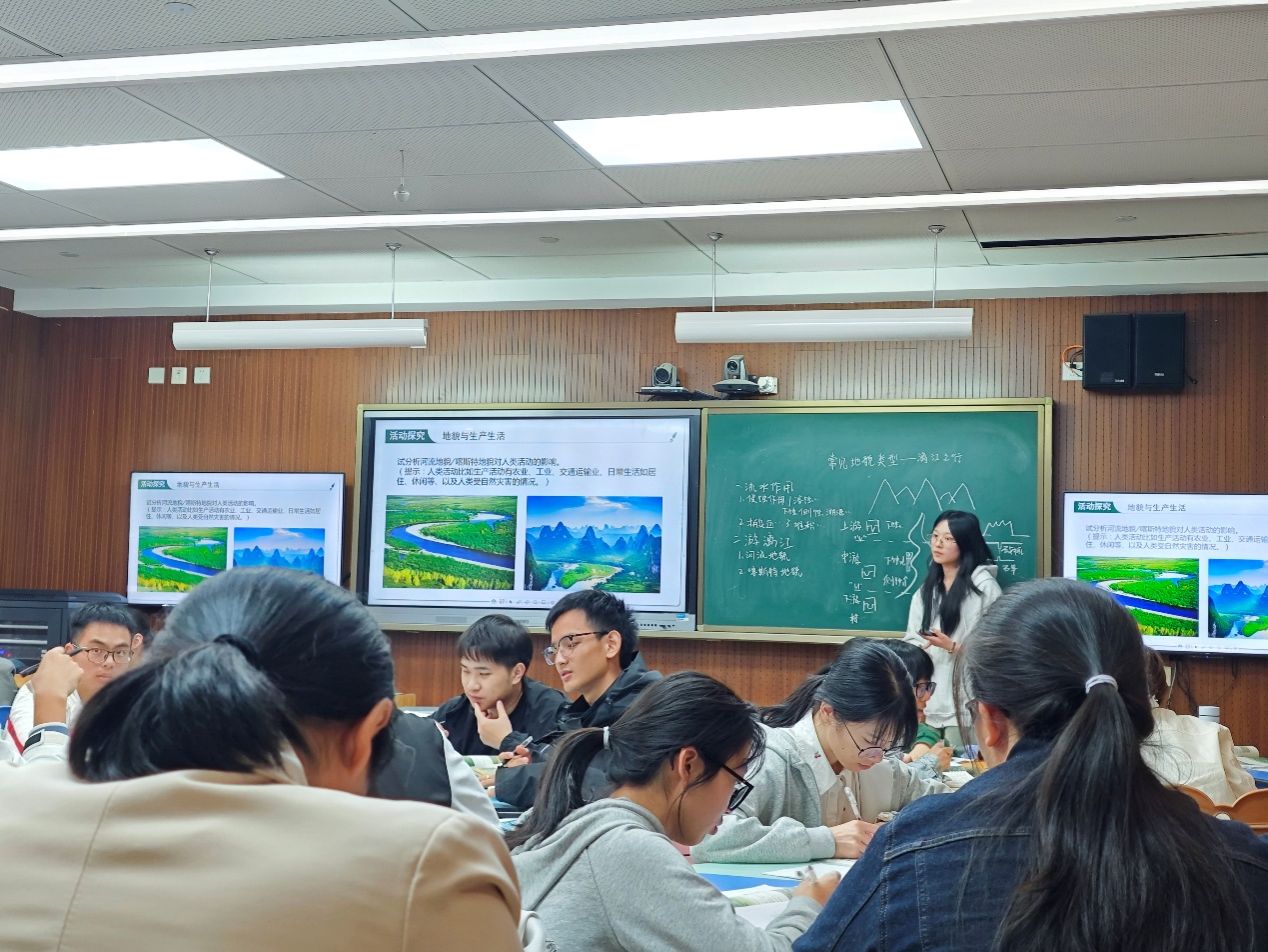 根据《地理教研创新训练》课程目标要求,本次活动邀请了正在宁波市第四中学进行教育实习的21级地理科学(师范)班同学,按照同课异构授课的形式讲授中学地理必修一第四章第一节《常见地貌类型》喀斯特地貌和河流地貌部分内容,随后进行了师生评课与教学设计讨论、交流。通过本次活动,同学们在解读课标、分析学情、建立地理教学逻辑等方面有极大收获,对课堂活动设计和实际授课讲演方式有了更深刻的理解。