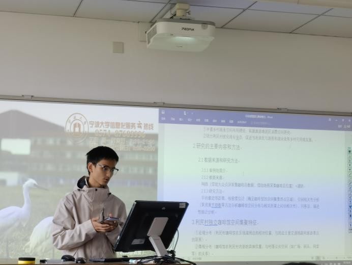 教学1班共分成5小组,围绕东钱湖这一核心区域自由选择要素并进行综合分析。经前期选题、文献阅读、大纲初稿撰写,各组代表分别在课堂上汇报本组的进展。本次课程汇报旨在考核学生小组分工的初步成果和区域分析研究的能力。