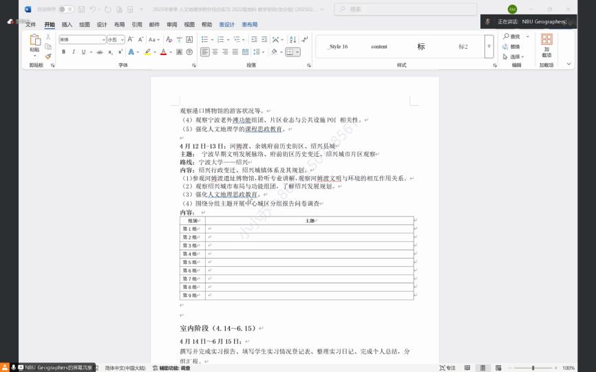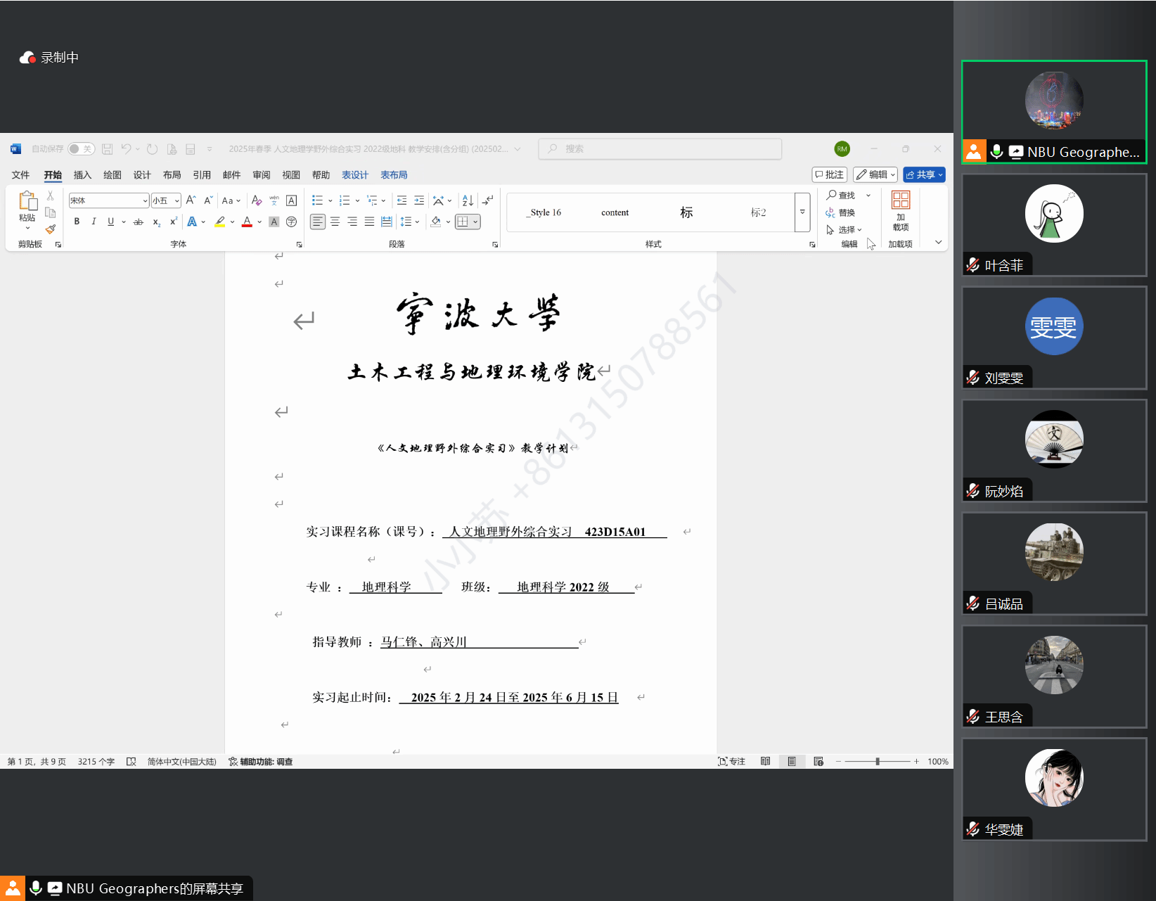 为确保2022级本科生《人文地理综合野外实习》课程的顺利开展,保障实习活动的安全、有序和高效进行,2025年2月26日晚8点,2022级地理科学(师范)班在线上举行了人文地理综合野外实习动员大会,实习指导老师马仁锋、高兴川、金文纨以及课程全体同学参与了本次会议。