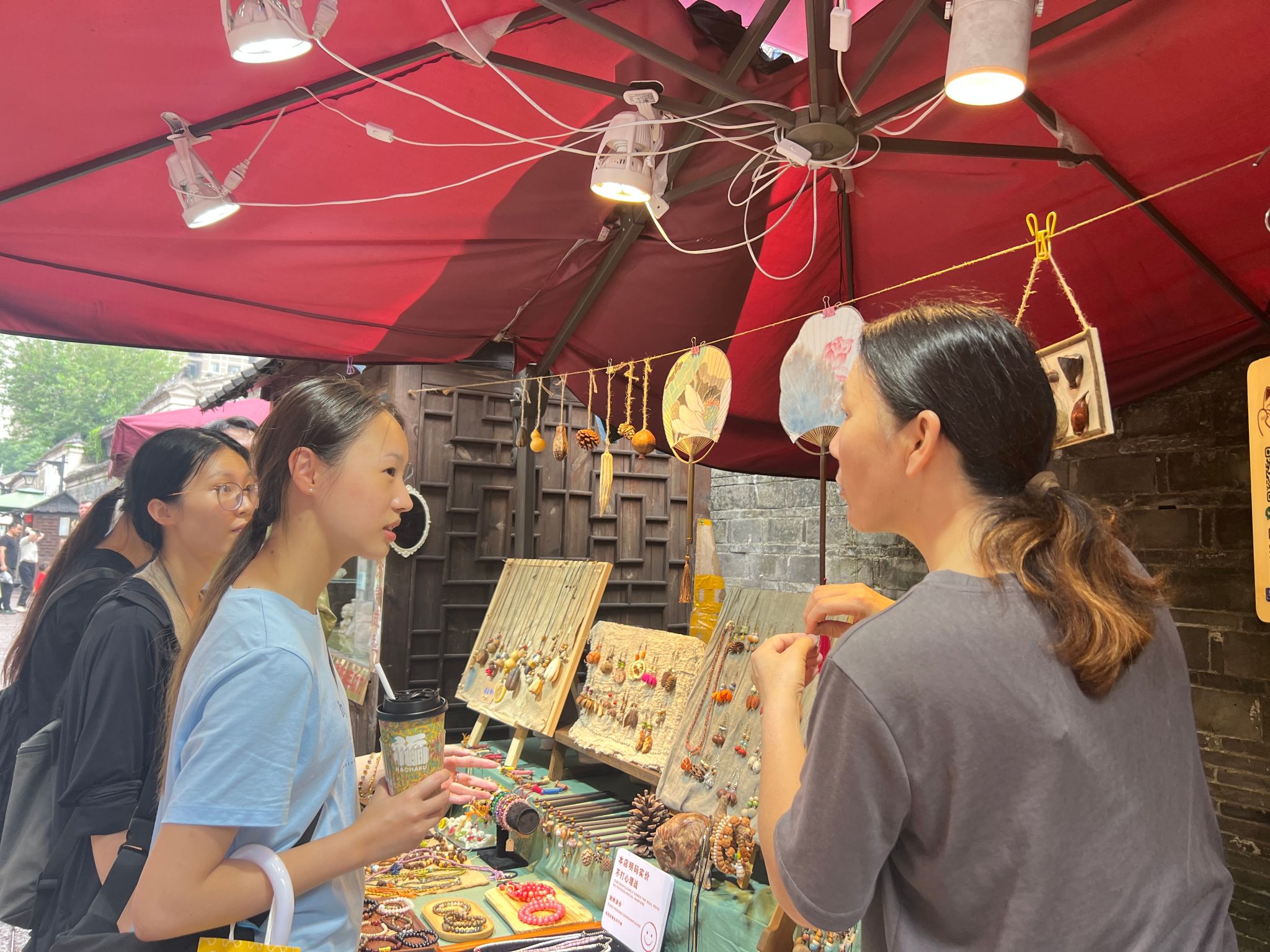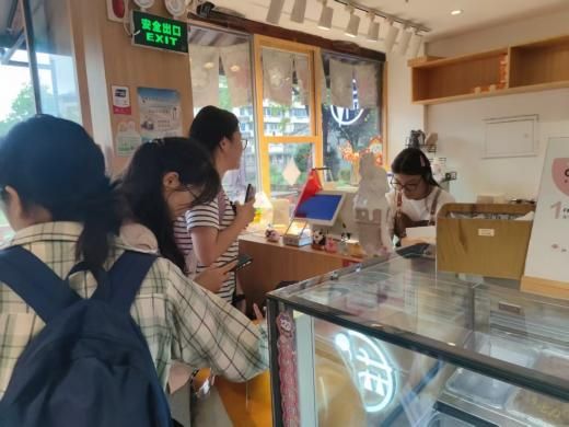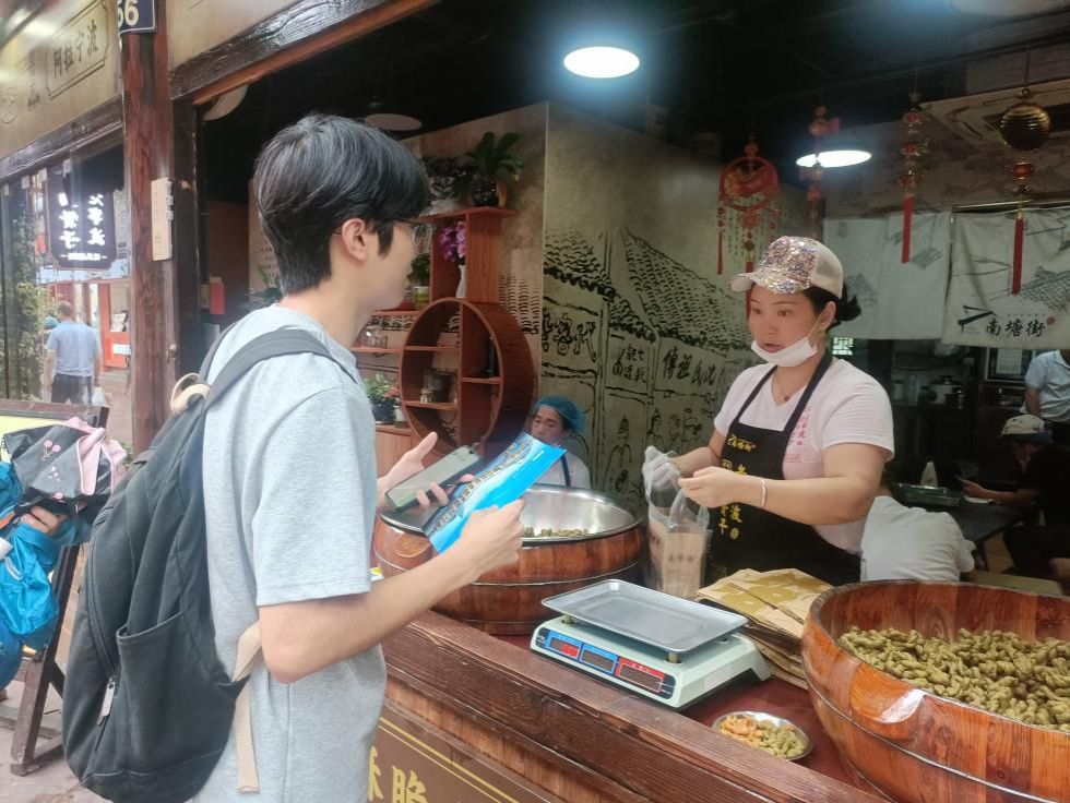 午饭过后,同学们分组开展调研活动,主要通过实地考察、商户访谈和问卷调查,了解南塘老街的配套基础设施情况、店铺业态业务情况、不同时段的客流量等等。调研发现,南塘老街的非遗商户较多,包括缸鸭狗、赵大有等中华老字号,以及白族扎染、德化瓷烧制等国家级非遗项目。北街以“时尚夜经济”为定位,引入Times咖啡馆、后备箱集市等新业态,形成“白天品古韵、夜晚享潮流”的消费场景。2024年春节假期,街区营业额达1455万元,同比增长17.22%,印证了业态创新的市场成效。调研过程中,同学们还偶遇了从新疆来宁波研学的小学生,小朋友对老街的美食与文化给予了肯定。