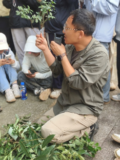 结束样方调查后,杨晓东老师在山顶示范植物标本的科学制作流程。