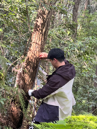 各班以4个小组为单位建立一个20m×20m的正方形样地,并用尼龙线将其划分成10m×10m的网格。各小组采用标准化调查规程展开乔木数据采集:测量物种坐标,通过目测法辨识物种组成和树高,以胸径尺环量1.3m处树干周长;同时运用估算法统计树冠投影面积(冠幅)与郁闭度。系统记录了样方内乔木层的物种多样性、空间分布格局及群落结构特征,为分析天童山群落演替提供了原始数据。