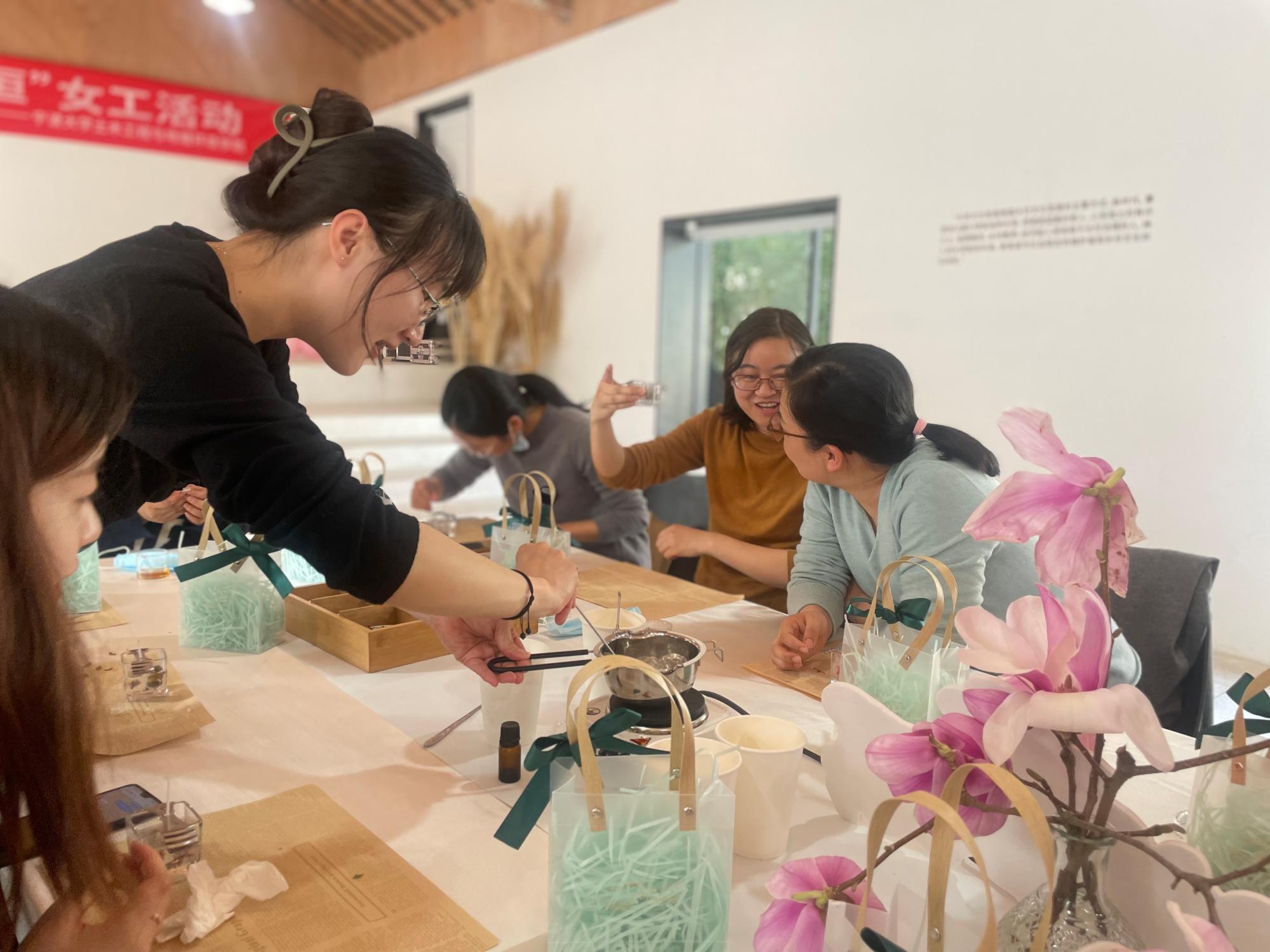 活动的工作人员提供并提前备好了天然豆蜡、精油、模具、干花及永生花等材料一一摆上桌来,同时还邀请了专业的制香老师详细地讲解和指导加热、调香、倒入模具、装饰脱模等制作环节,伴随着午后暖暖的阳光和精致的茶点,女教工们开启了一段有趣的香薰蜡烛手工制作活动。各种各样模具让大家在制作过程中更是增添了一些乐趣,女教工们纷纷将豆蜡加热溶解后精心的和香氛精油调制融合,再小心翼翼的倒入模具,等待冷却过程中大家认真构思、巧妙搭配,在巧手翻飞下,完成了各式各样色彩缤纷、春意盎然的纯手工作品,让美好春色留在了香薰蜡烛里。