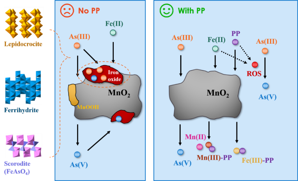 过往研究中,我们发现向体系中添加环境配体焦磷酸盐(PP)能够通过抑制氧化锰矿物表面Mn(III)沉淀的形成,增强对As(III)的氧化效率,然而,As(III)-MnO2-PP系统中因Fe2+存在而引起的多元耦合行为却很少被研究。因此,本研究通过溶液化学分析和多种谱学和显微分析技术结合,探究PP对Fe(II)存在下水钠锰矿氧化As(III)过程的影响并揭示其反应机理。此外,使用高效的As吸附剂水铁矿进一步评估随后的As(V)去除处理效率。