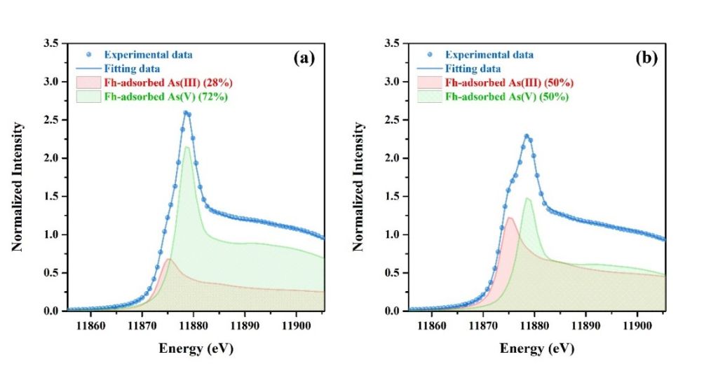 为了进一步量化矿物表面不同形态As的含量分布,使用X射线近边吸收光谱(XANES)对固体样品产物在As K边采集图谱。结果表明,吸附在铁氧化物表面的As同时以As(III)和As(V)两种形态存在(图4)。吸附在铁氧化物表面的As(III)比例增加可能与As(III)和Fe(II)在水钠锰矿表面的竞争性氧化有关,同时新生成的铁氧化物将As(III)吸附在其表面,抑制水钠锰矿与As(III)的相互作用,因此高浓度Fe(II)存在下,矿物表面吸附了更高比例的As(III)。