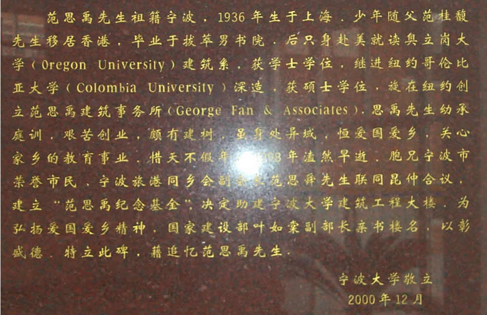 范思禹先生祖籍宁波,1936 年生于上海,少年随父范桂馥先生移居香港,毕业于拔萃男书院,后只身赴美就读奥立岗大学 (Oregon University)建筑系,获学士学位,继进纽约哥伦比亚大学 (Colombia Universitv ) 深造,获硕士学位,旋在纽约创立范思禹建筑事务所(George Fan & Associales )。思禹先生幼承庭训,艰苦创业,颇有建树,虽身处异域,恒爱国爱乡。关心家乡的教育事业、惜天不假年,1998年溘然早逝。胞兄宁波市荣誉市民,宁波旅港同乡会副会长范思舜先生联同昆仲合议,建立“范思禹纪念基金”,决定助建工口漫画 建筑工程大楼,为弘扬爱国爱乡精神,国家建设部叶如棠副部长亲书楼名,以彰盛德。特立此碑,藉追忆范思禹先生。